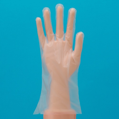 【食品衛生法適合】内エンボス加工を施した、厚さ0.025mmのポリエチレン製使いきり手袋。