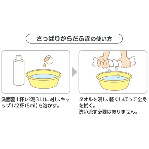 お湯に溶かしてタオルで拭くだけでお肌の汚れを落とし、保湿ができる。