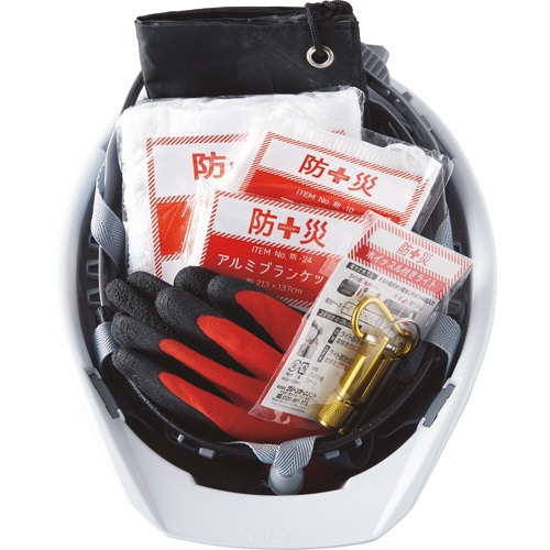 商品仕様 | ●セット内容/ヘルメット、ボディタオル、手袋、マスク3枚、ホイッスル付ライト、アルミブランケット、ナップサック ●外寸/W227×D280×H135mm ●重量/約390g ●その他仕様/[ヘルメット仕様] ●色:ホワイト ●使用区分:飛来・落下物、電気絶縁(電気7000V以下) |