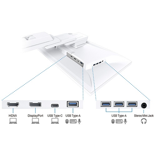●4ポート(Type-A)のUSBハブを搭載。USB機器をモニターに接続して使用できます。USBポートの少ないノートPCでもUSB Type-Cケーブルでモニターと接続するだけで、キーボードやマウス、USBメモリーなどのUSB機器をすぐに使えます。