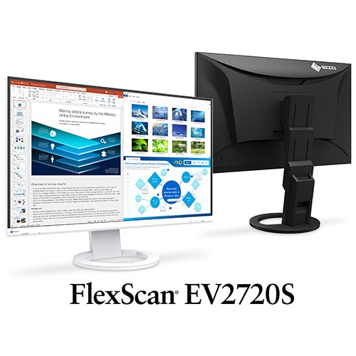 ●EV2720Sは27型WQHD(2560×1440)解像度の3辺フレームレスモニター。本体色はブラック、スタンドありです。