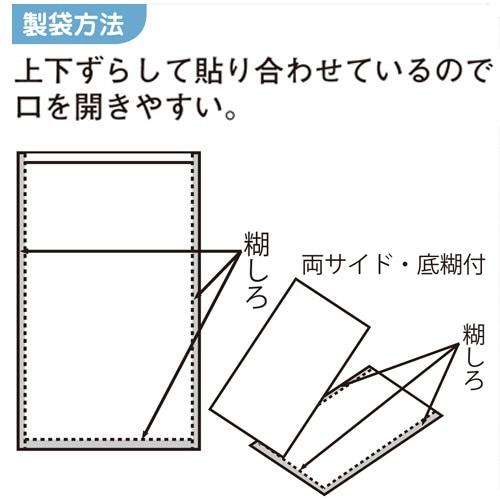 ●製袋方法:上下ずらして貼り合わせているので口を開きやすい。