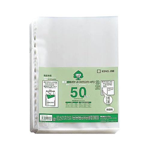 キングジム 再生透明ポケット A4タテ 2・4・30穴 207P-50 1パック(50枚)