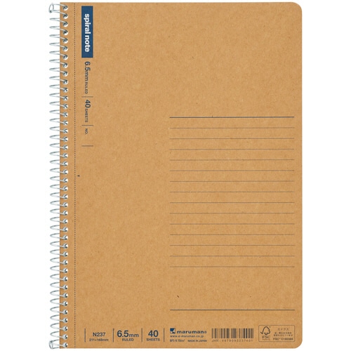 商品仕様 | ●サイズ/A5 ●寸法/タテ211×ヨコ155mm ●罫幅/6.5mm ●枚数/40枚 ●行数/26行 ●坪量/70g/m2 ●材質/表紙:クラフトボール、中紙:上質紙 ●その他仕様/●スパイラル製本(コイルループ) ●ミシン目入 |