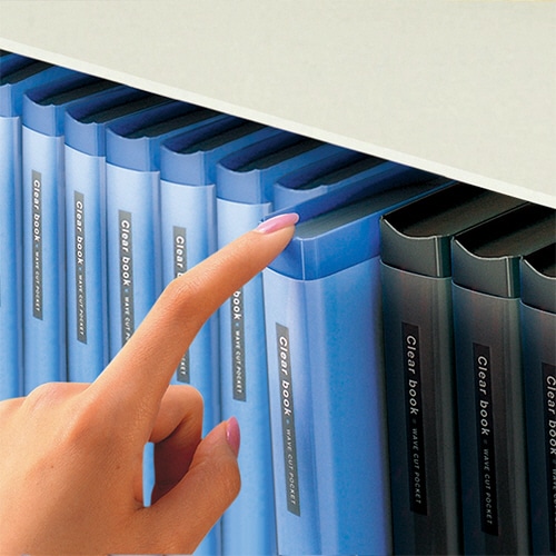 【固定式】【ユニバーサルデザイン】工夫満載のNEWタイプクリヤーブック。ポケットは出し入れしやすいウェーブカット、背上部のフィンガーカットで棚から出し入れ簡単!