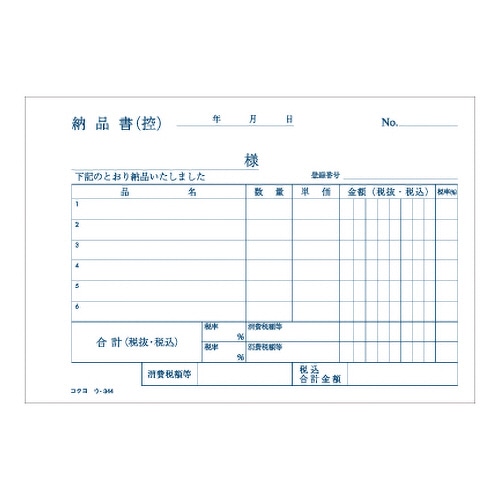 コクヨ NC複写簿(ノーカーボン)4枚納品書(請求・受領付き) A6ヨコ型 6行 50組 ウ-344 1冊