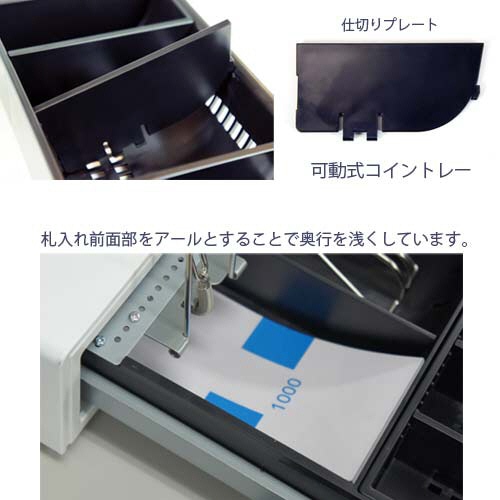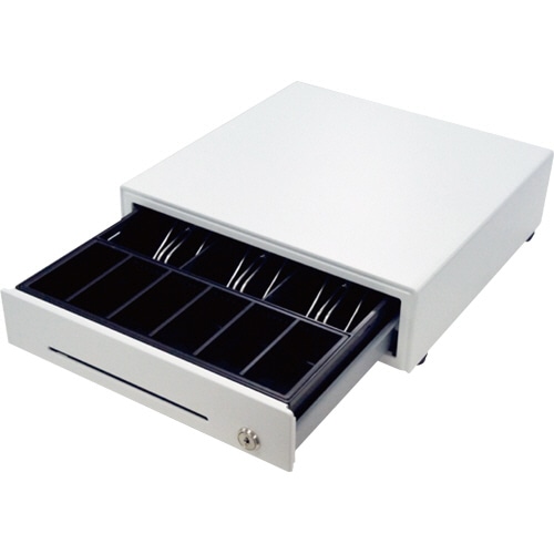 ●手動開閉式キャッシュドロア、本体色はホワイトです。