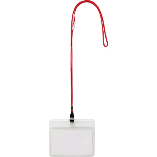 ●大きめの防水チャック付吊り下げ名札。ストラップ色は赤です。
