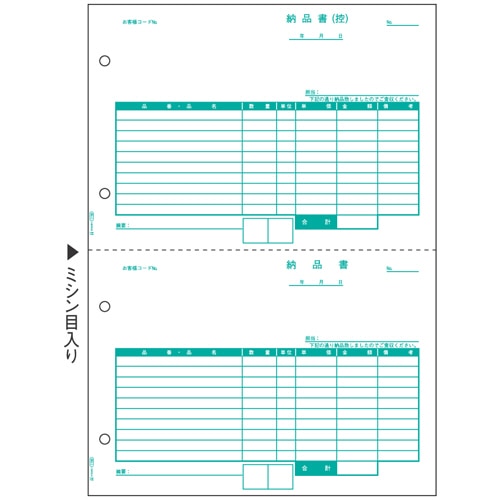 | 商品仕様 | ●様式/納品書 ●用紙タイプ/カット紙 ●サイズ/A4タテ ●寸法/297×210mm ●ミシン目切り離し後サイズ/210×148.5mm ●面付/2面 ●複写内訳/1段目:納品書(控)、2段目:納品書 ●とじ穴/4穴 ●とじ穴間隔/80mm ●坪量/70g/m2 ●厚み/約0.09mm ●白色度/80% ●備考/※対応パッケージソフトの最新情報はメーカーホームページをご覧ください。 ※2021年12月頃より順次、原紙の変更に伴い白色度が約78%→約80%に変更になります。 |