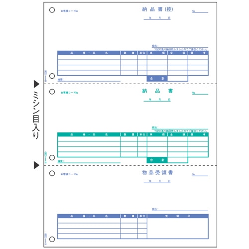 商品仕様 | ●様式/納品書 ●用紙タイプ/カット紙 ●サイズ/A4 ●寸法/210×297mm ●ミシン目切り離し後サイズ/210×99mm ●面付/3面 ●とじ穴/2穴 ●坪量/70g/m2 ●厚み/0.09mm ●白色度/80% ●備考/※2021年12月頃より順次、原紙の変更に伴い白色度が約78%→約80%に変更になります。 |