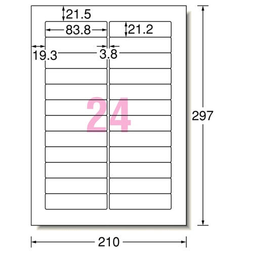 商品仕様 | ●サイズ/A4 ●シートサイズ/210×297mm ●ラベルサイズ/21.2×83.8mm ●面付け/24面 ●紙質/上質紙 ●坪量/125g/m2 ●ラベルの厚み/0.07mm ●総厚み/0.13mm ●白色度/81% ●紙色/ホワイト ●重量/149g |