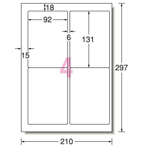 商品仕様 | ●サイズ/A4 ●シートサイズ/210×297mm ●ラベルサイズ/92×131mm ●面付け/4面 ●紙質/上質紙 ●坪量/150g/m2 ●ラベルの厚み/0.11mm ●総厚み/0.17mm ●白色度/73% ●紙色/ホワイト ●重量/120g ●再剥離/○ ●下地が隠せる/○ |