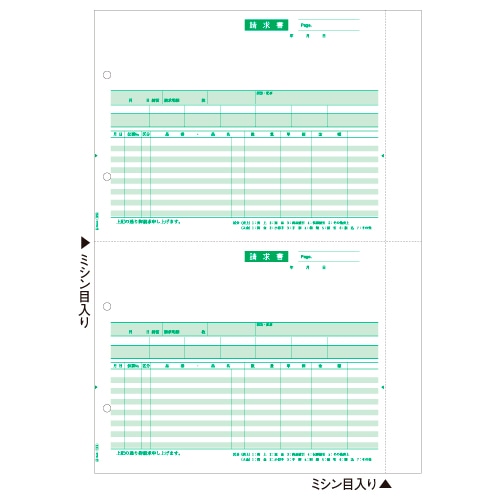 | 商品仕様 | ●様式/合計請求書 ●用紙タイプ/カット紙 ●サイズ/B4タテ ●寸法/364×257mm ●ミシン目切り離し後サイズ/182×229mm ●面付/2面 ●紙質/上質紙 ●刷色/緑 ●複写内訳/1段目:請求書、2段目:請求書 ●とじ穴/4穴 ●とじ穴間隔/80mm ●坪量/64g/m2 ●厚み/約0.08mm ●白色度/約80% ●備考/※対応パッケージソフトの最新情報はメーカーホームページをご覧ください。 ※2020年10月頃より順次、原紙が海外紙から品質の安定した国産紙に切り替わります。原紙の変更に伴い白色度や坪量等が変更になり、落ち着いた色合い、また手触り感などの風合いも若干変わります。 |