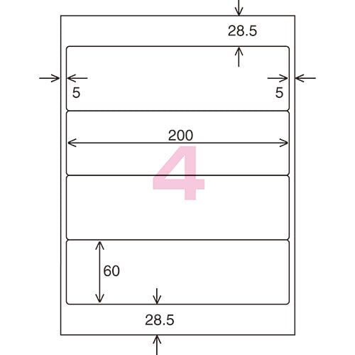 商品仕様 | ●サイズ/A4 ●シートサイズ/210×297mm ●ラベルサイズ/60×200mm ●面付け/4面 ●坪量/139g/m2 ●ラベルの厚み/0.07mm ●総厚み/0.15mm ●白色度/約85% ●重量/9g |