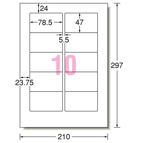 商品仕様 | ●サイズ/A4 ●シートサイズ/210×297mm ●ラベルサイズ/47×78.5mm ●面付け/10面 ●紙質/上質紙+レーザー専用塗工 ●坪量/120g/m2 ●ラベルの厚み/0.07mm ●総厚み/0.13mm ●白色度/82% ●紙色/ホワイト ●重量/128g |