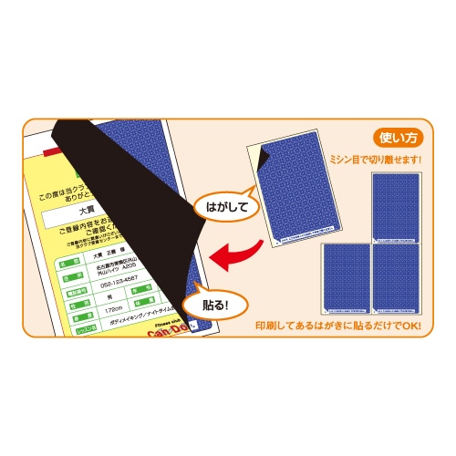●台紙からラベルをはがして、手持ちのはがきに貼るだけで、情報を保護することができる目隠し用ラベルです。ラベル一枚ごとに切り離せるように、台紙にミシン目が入っています。表面は地紋入りなので面倒な印刷はまったく不要。