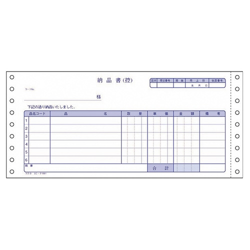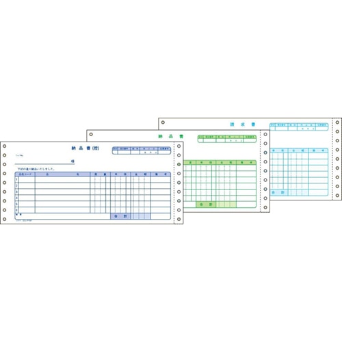 | 商品仕様 | ●様式/納品書(請求付き、税額欄なし) ●用紙タイプ/連続用紙 ●サイズ/Y10×T4 1/2 ●寸法/114.3×254mm ●紙質/ノーカーボン紙(ブルー発色) ●刷色/1P:藍、2P:緑、3P:青 ●複写枚数/3P ●複写内訳/納品書(控)、納品書、請求書 ●フィーダ穴/12.7mm ●白色度/81%程度 ●備考/※白色度はISO白色度 |