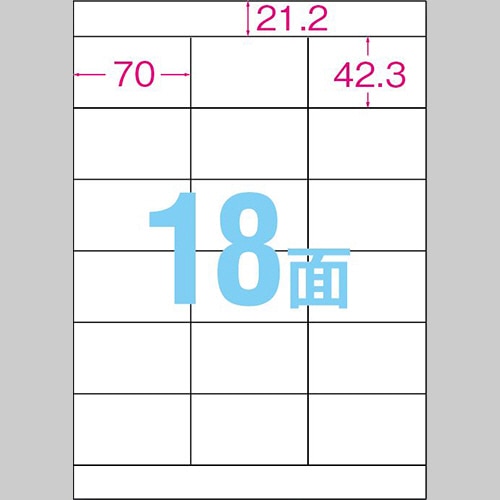 | 商品仕様 | ●サイズ/A4 ●シートサイズ/210×297mm ●ラベルサイズ/42.3×70.0mm ●面付け/18面 ●カット内容/3列×6段 ●紙質/上質紙 ●総厚み/約0.135mm ●白色度/約84% ●紙色/白無地 ●備考/※厚紙モード、手差し給紙でお使いください。また、お使いの機種によっては対応しない場合がございます。 ※インクジェットプリンタの場合、にじみが生じる場合がございます。 |