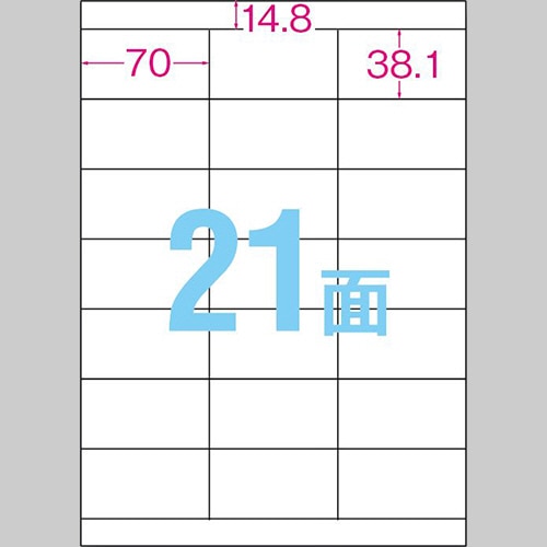 | 商品仕様 | ●サイズ/A4 ●シートサイズ/210×297mm ●ラベルサイズ/38.1×70.0mm ●面付け/21面 ●カット内容/3列×7段 ●紙質/上質紙 ●総厚み/約0.135mm ●白色度/約84% ●紙色/白無地 ●備考/※厚紙モード、手差し給紙でお使いください。また、お使いの機種によっては対応しない場合がございます。 ※インクジェットプリンタの場合、にじみが生じる場合がございます。 |