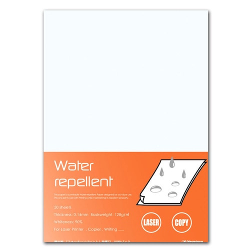 | 商品仕様 | ●サイズ/A4 ●寸法/210×297mm ●紙質/撥水紙 ●坪量/128g/m2 ●厚み/0.14mm ●白色度/約90% ●印刷面/表裏なし ●連量/110kg ●原紙規格/四六判 ●その他仕様/●対応プリンター:モノクロコピー、モノクロレーザー、カラーレーザー、インクジェット ●備考/※インクジェットプリンタではお使いいただけません。 |