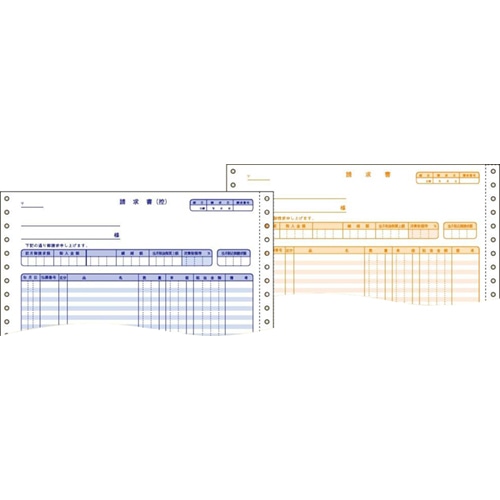 | 商品仕様 | ●様式/請求書(税抜方式、税額記入用合計欄あり) ●用紙タイプ/連続用紙 ●サイズ/Y10×T11 ●寸法/279.4×254mm ●紙質/ノーカーボン紙(ブルー発色) ●刷色/1P:藍、2P:茶 ●複写枚数/2P ●複写内訳/請求書(控)、請求書 ●フィーダ穴/12.7mm ●白色度/81%程度 ●備考/※白色度はISO白色度 |