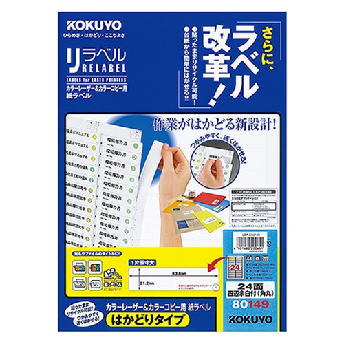 コクヨ カラーレーザー&カラーコピー用 紙ラベル(リラベル)(はかどりタイプ) A4 24面四辺余白付(角丸) 21.2×83.8mm LBP-E80149 1