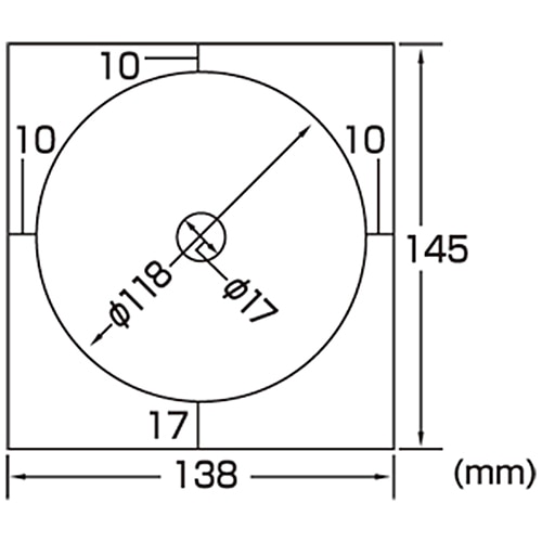 商品仕様 | ●シートサイズ/138×145mm ●ラベルサイズ/118×118mm ●面付け/1面 ●ラベルの厚み/0.099±0.008mm ●総厚み/0.178±0.007mm ●白色度/100% ●紙色/白 ●強粘着/○ ●その他仕様/●ラベル内径:17mm |