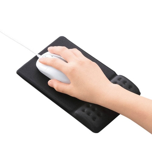 ●手首の疲労を軽減するリストレスト一体型のマウスパッドです。低反発ポリウレタンを採用したリストレスト部が手首に優しくフィットし、動きに応じて荷重を吸収・分散します。新開発の凹凸(ディンプル)加工により、通気性と快適性がいちだんと向上しています。
