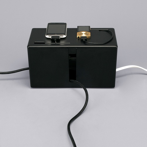 ●携帯電話やiPodをフタの上に置いた際に充電しやすい「天面ケーブルホール」や3方向にケーブルを伸ばせる側面の隙間が通気孔となり、ボックス内の温度を下げる安全設計