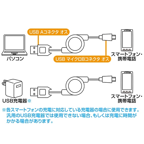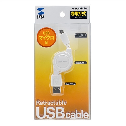 サンワサプライ 巻き取りUSB2.0モバイルケーブル (A)オス-Micro(B)オス ホワイト 0.8m KU-M08MCBW 1個