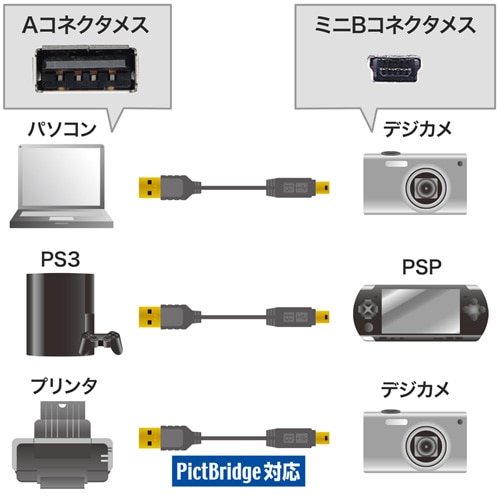 | 適応機種 | USBポート(Aコネクタ)を持っている機種、ミニUSB Bコネクタ(5pin)を持つ周辺機器 |