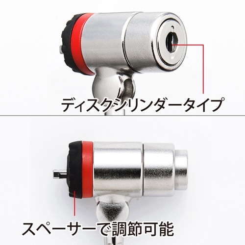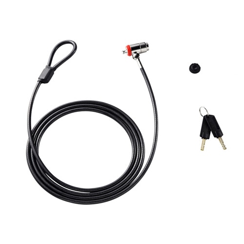商品仕様 | ●錠タイプ/シリンダ錠 ●ワイヤー径/5.2mm ●ワイヤー長/2m ●錠部サイズ/32.3×26.3mm・直径:17mm ●質量/188g ●セット内容/本体(鍵付ワイヤー)×1、鍵×2、スペーサー×1(本体にあらかじめ取付け済) ●備考/※機器側の規格により、スロットの深さが合わない場合があります。 |
