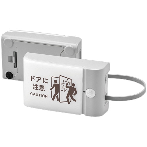 商品仕様 | ●色/ライトグレー ●材質/本体:ABS ●表示内容/ドアに注意 ●取付仕様/マグネット ●その他仕様/●有線タイプ ●サイズ:約W105×D35×H63mm ●ケーブル長さ:約160mm ●電源:1台あたり単3形アルカリ乾電池×6本(別売) ●電池寿命:約2年(1日あたり30回センサーが感知時) ●感知距離:本体に向かう時/最大約1.5m、本体の正面を横切る時/最大約4.0m ●感知角度:水平方向/約120°、垂直方向/約120° ●質量:約210g(電池含まず) ●セット内容:本体(親機・子機)、取扱説明書 ●保証期間:1年 ●品 種/室内用センサーライト |