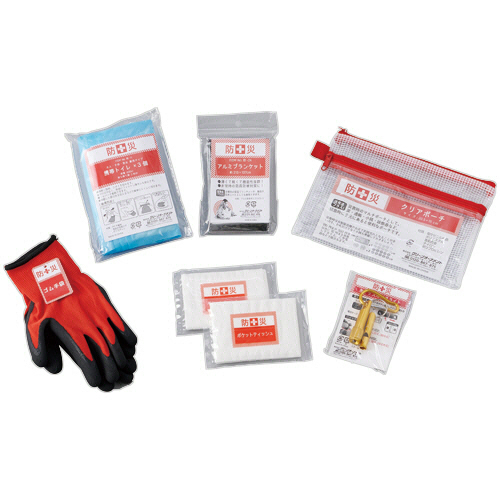 | 商品仕様 | ●セット内容/クリアポーチ、ホイッスル付きライト、ポケットティッシュ×2、アルミブランケット、携帯トイレ(3回分)、ゴム手袋 ●外寸/W205×D×H150mm |