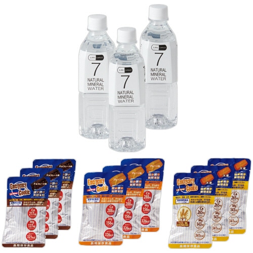 商品仕様 | ●セット内容/エマージェンシークッキー(チョコ 、プレーン 、大麦 各3食)、保存水(500mL)×3本 ●人数/1人 ●日数/3日 ●カロリー/988kcal(1日あたり) ●寸法/W235×D90×H235mm ●重量/約2.5kg ●その他仕様/●保存期間:7年 ●備考/※寸法・重量は外箱の値。 ※通常ご納品までに、2~3週間かかる場合がございます。また、需要期や非常時の場合、お届けまでに4週間以上かかる場合がありますことをご了承ください。 |