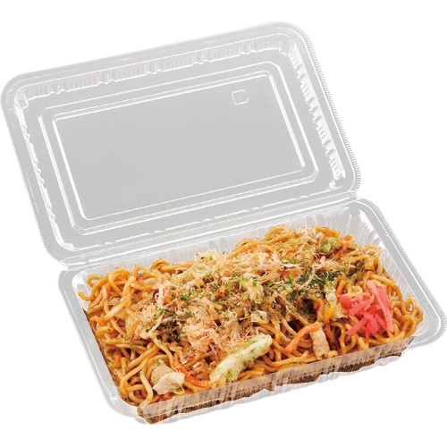 お手軽!屋台や総菜コーナーでおなじみ、フタ一体型使い切り容器。