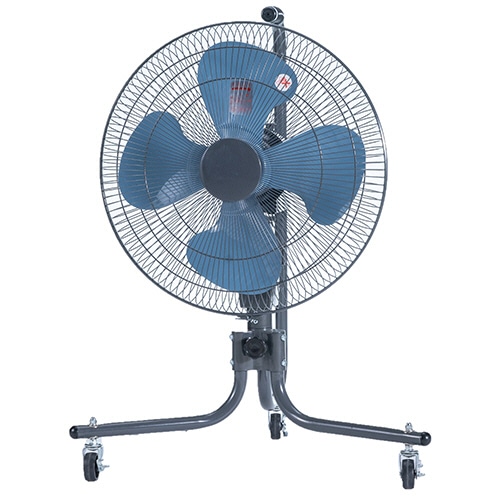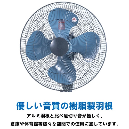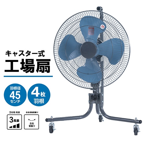風量3段階、左右首振り・上下首折れ機能付きのキャスター式工場扇