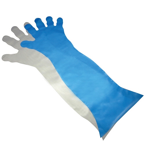 【食品衛生法適合】ほぼ腕全体を覆うロングタイプの使いきり低密度ポリエチレン手袋。