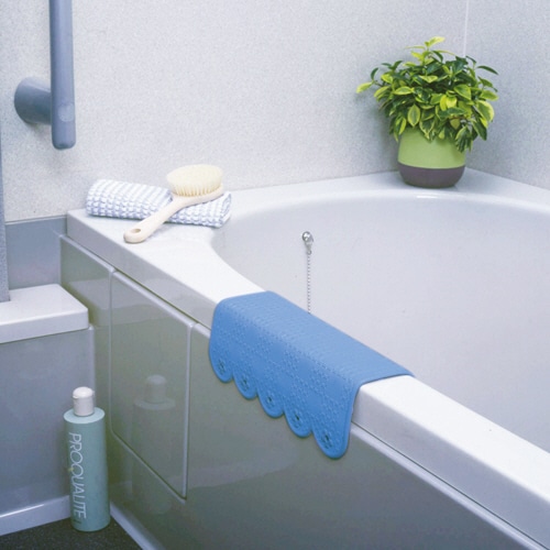 ●浴槽の縁など、自然と手がいく場所に取りつけて手の滑りを防ぐ浴槽手すりマットのブルーです。