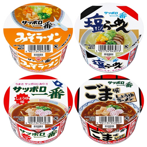 | 商品仕様 | ●アソート内容/しょうゆ味:42g、みそ:46g、塩:41g、塩とんこつ:44g ●カロリー/175~195kcal ●賞味期限/商品の発送時点で、賞味期限まで残り60日以上の商品をお届けします。 ●備考/※10月中旬販売開始予定。 ※国内で製造いたしております。 ※原材料は厳格にチェックした安全なものを使用いたしております。 ※メーカー都合により、パッケージデザインおよびセット内容・仕様が変更になる場合がございます。 ●シリーズ名/サッポロ一番 |