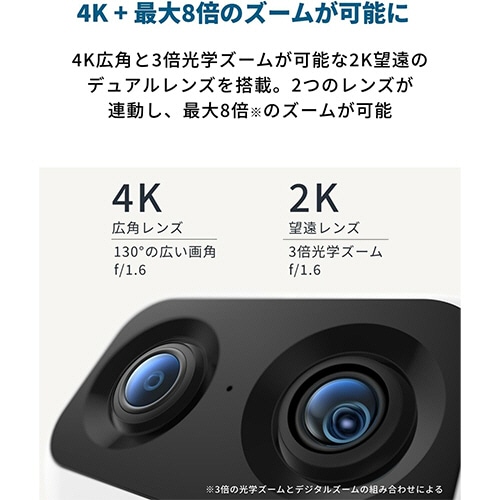 ●4K広角レンズと2K望遠レンズが連動することにより、最大8倍のズームが可能に。細部まで見逃さず、部屋の隅々をモニタリングできます。
