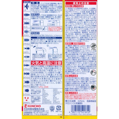 | 商品仕様 | ●効果/殺虫 ●対象害虫/ムカデ、ケムシ、ヤスデ、クモ、クロアリ、シロアリ、ダンゴムシ、ガ、ハチ、アブ、カメムシ 等、計34種類 ●内容量/450ml ●有効成分/ピレスロイド(d-T80-フタルスリン、シフルトリン) ●シリーズ名/キンチョール |