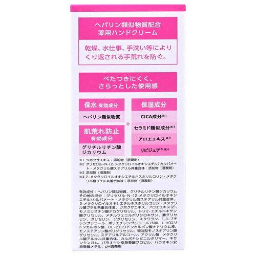 ●成分/[有効成分]ヘパリン類似物質、グリチルリチン酸ジカリウム [その他成分]グリセリル-N-(2-メタクリロイルオキシエチル)カルバメート・メタクリル酸ステアリル共重合体、2-メタクリロイルオキシエチルホスホリルコリン・メタクリル酸ブチル共重合体液、ツボクサエキス、アロエエキス(2)、モノミリスチン酸デカグリセリル、トリ2-エチルヘキサン酸グリセリル、メチルフェニルポリシロキサン、濃グリセリン、グリセリン、ジグリセリン、スクワラン、1.3-ブチレングリコール、ポリエチレングリコール1500、L-ピロリドンカルボン酸、DL-ピロリドンカルボン酸ナトリウム液、モノステアリン酸ポリグリセリル、親油型モノステアリン酸グリセリル、ステアリルアルコール、アクリル酸・メタクリル酸アルキル共重合体、カルボキシビニルポリマー、キサンタンガム、パラオキシ安息香酸プロピル、パラオキシ安息香酸メチル、pH調整剤
