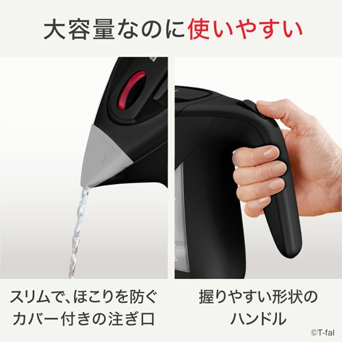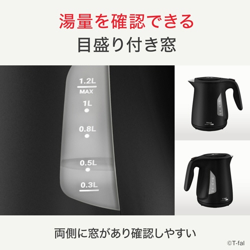 商品仕様 | ●容量/1200mL ●色/ブラック ●沸騰目安時間/カップ1杯(140mL):約1分、満水:約6分 ●消費電力/1250W ●電源/100V~(50/60Hz) ●電源ケーブル長さ/約1.3m ●寸法/W約24×D16×H22cm ●質量/約1140g ●その他仕様/●機能:転倒お湯もれロック、自動電源オフ、空だき防止機能、パイロットランプ ●温度ヒューズ:192℃ ●原産国:中国 ●保証期間/1年 ●備考/※重量は電源プレートを含む。 ※仕様・デザインは変更になることがあります。 ※本製品は日本国内のみで使用できます。 ●シリーズ名/T-fal |