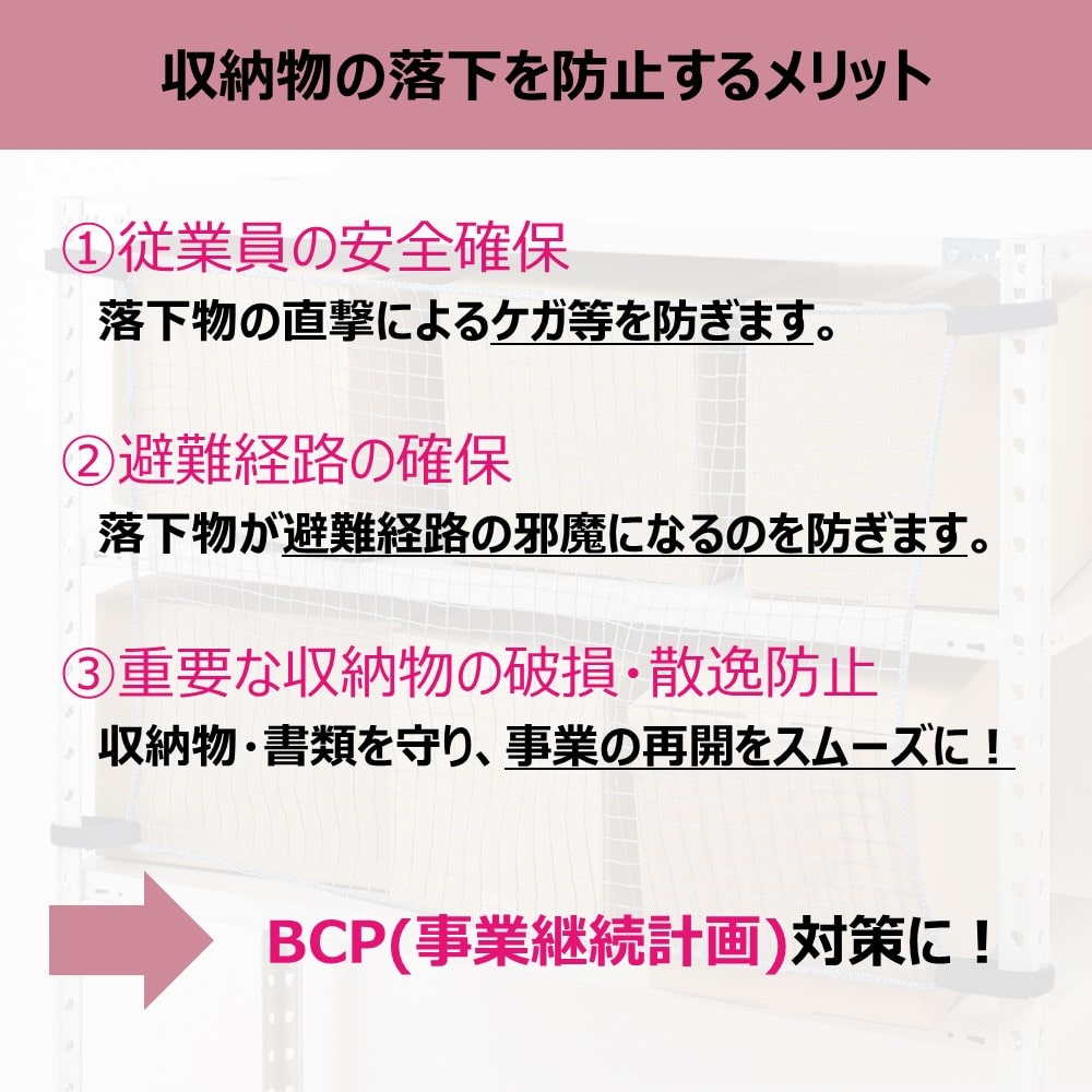 | 商品仕様 | ●種類/落下防止用品 ●寸法/W約2460×D×H700mm ●取付範囲/約1700~1760mm ●耐荷重/約200kg ●耐震度/震度7相当 ●材質/ネット:ポリエチレン、面ファスナー:ナイロン ●その他仕様/●対応ラック:横幅/1800mm、縦幅/700mm ●対応支柱:外周寸法約120~210mm(Cチャンネル 30×30/40×40/45×45/50×50/55×45、Lアングル 40×40/50×50/40×60) |