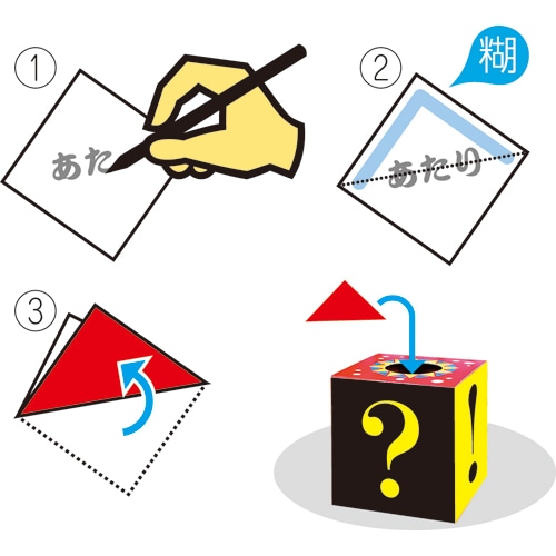 ●1.裏面に好みの内容(等級や文字)を記入します。2.くじの端2カ所にのりを塗ります。3.三角形になるように折り端をとめます。