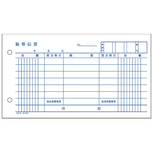 コクヨ 振替伝票(仮受け・仮払い消費税額表示入り) タテ106×ヨコ194mm 2枚複写 バックカーボン 50組 テ-210 1冊
