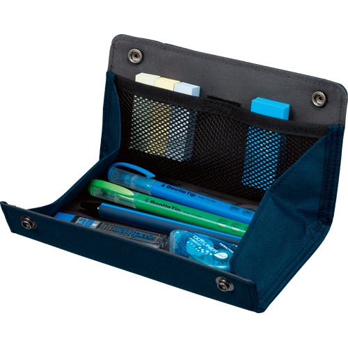 ●デスク上ではペントレーに。フラップが大きく開くので、中身が見やすく、取り出しやすく便利です。内側にはメッシュポケットがあり、分けておきたい物の整理ができます。