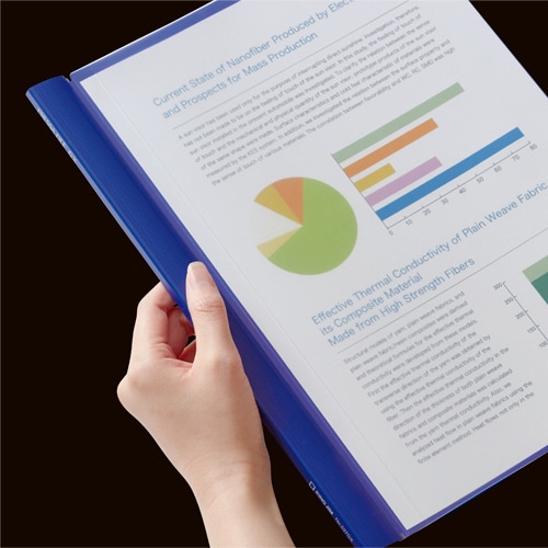 ●中に入れた書類が確認できる裏表紙が黒のプレゼンファイル。