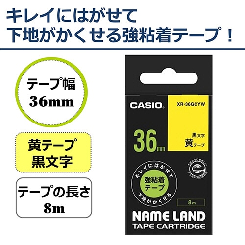 カシオ NAME LAND キレイにはがせて下地がかくせる強粘着テープ 36mm×8m 黄/黒文字 XR-36GCYW 1個